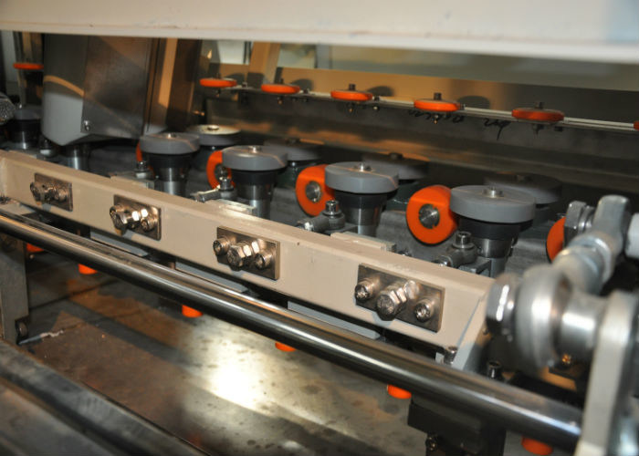 5, la ruota anteriore ed indietro laterale di compressione tutto l'attivamente sono mossi e trasportano. Non c'è nessun mater la dimensione di vetro grande /small o spessore differente (8mm), interamente garantisce uniformemente il passaggio di vetro da parte a parte. (Stessi come LISEC)
